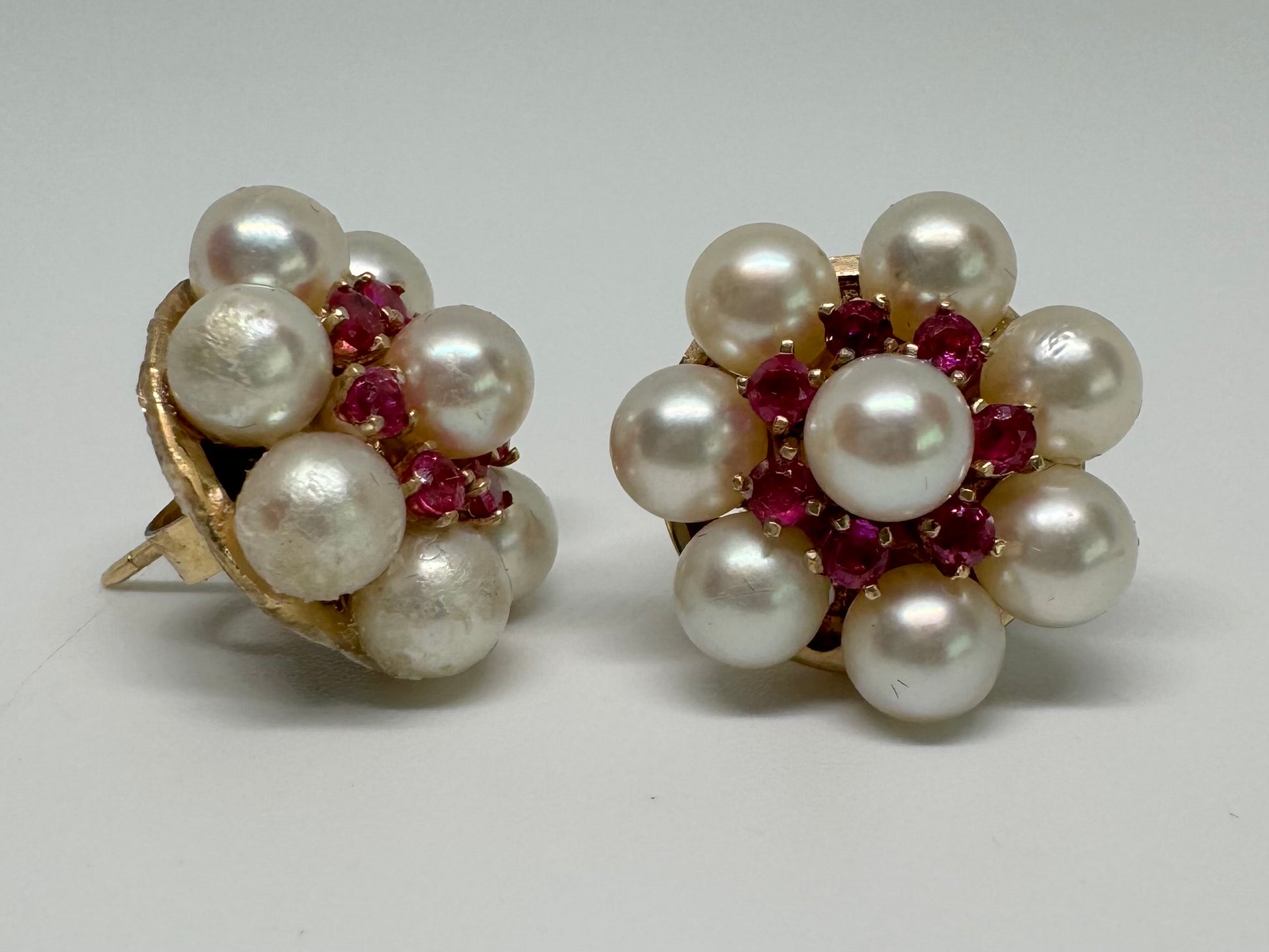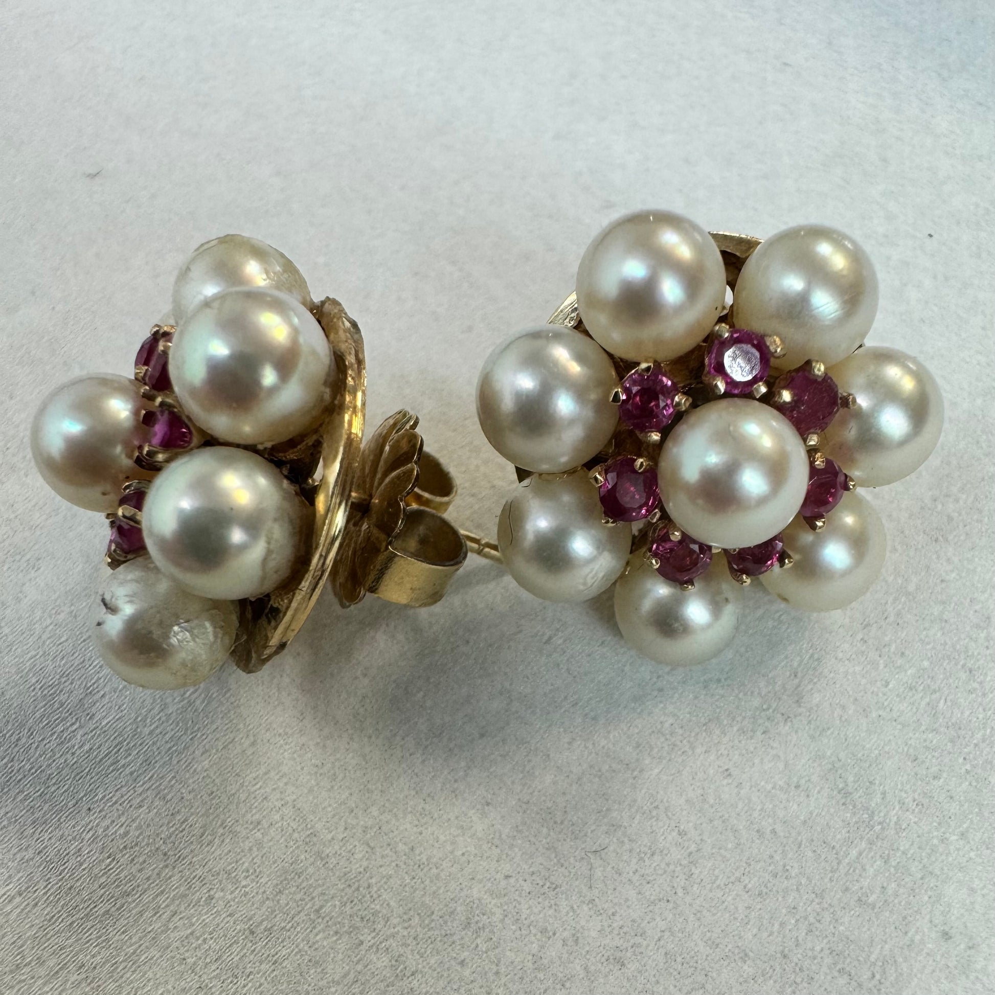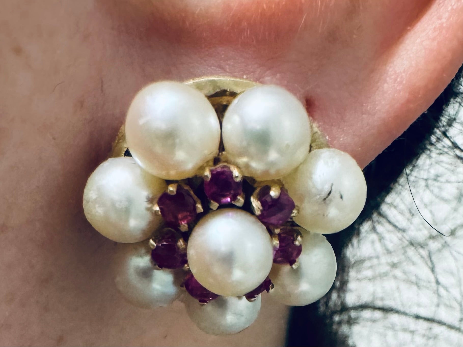 עגילי זהב צהוב 14 קראט גדולים צמודים לאוזן משובצים רובי ופנינים