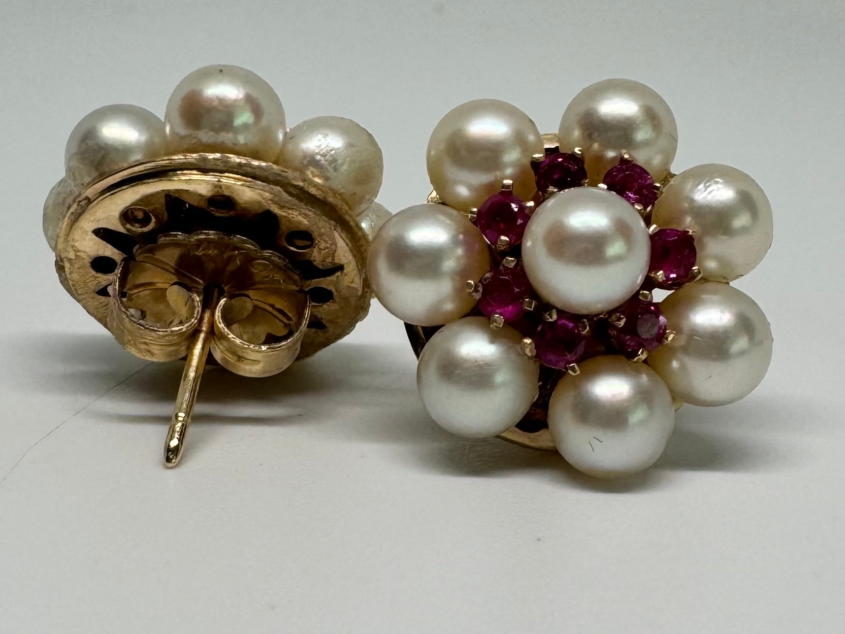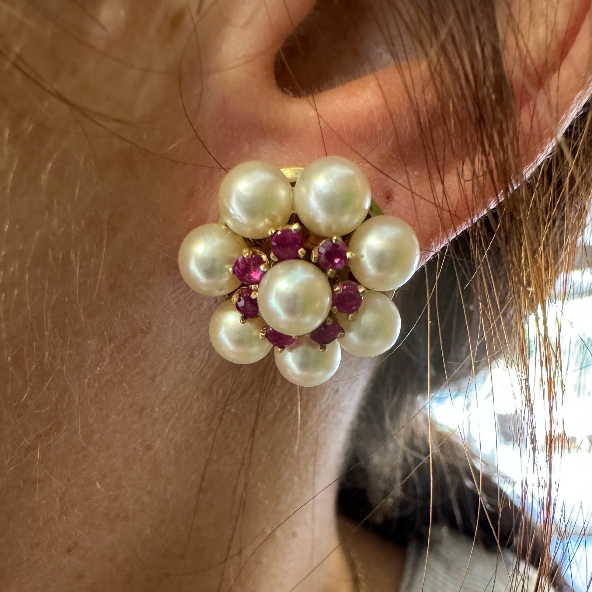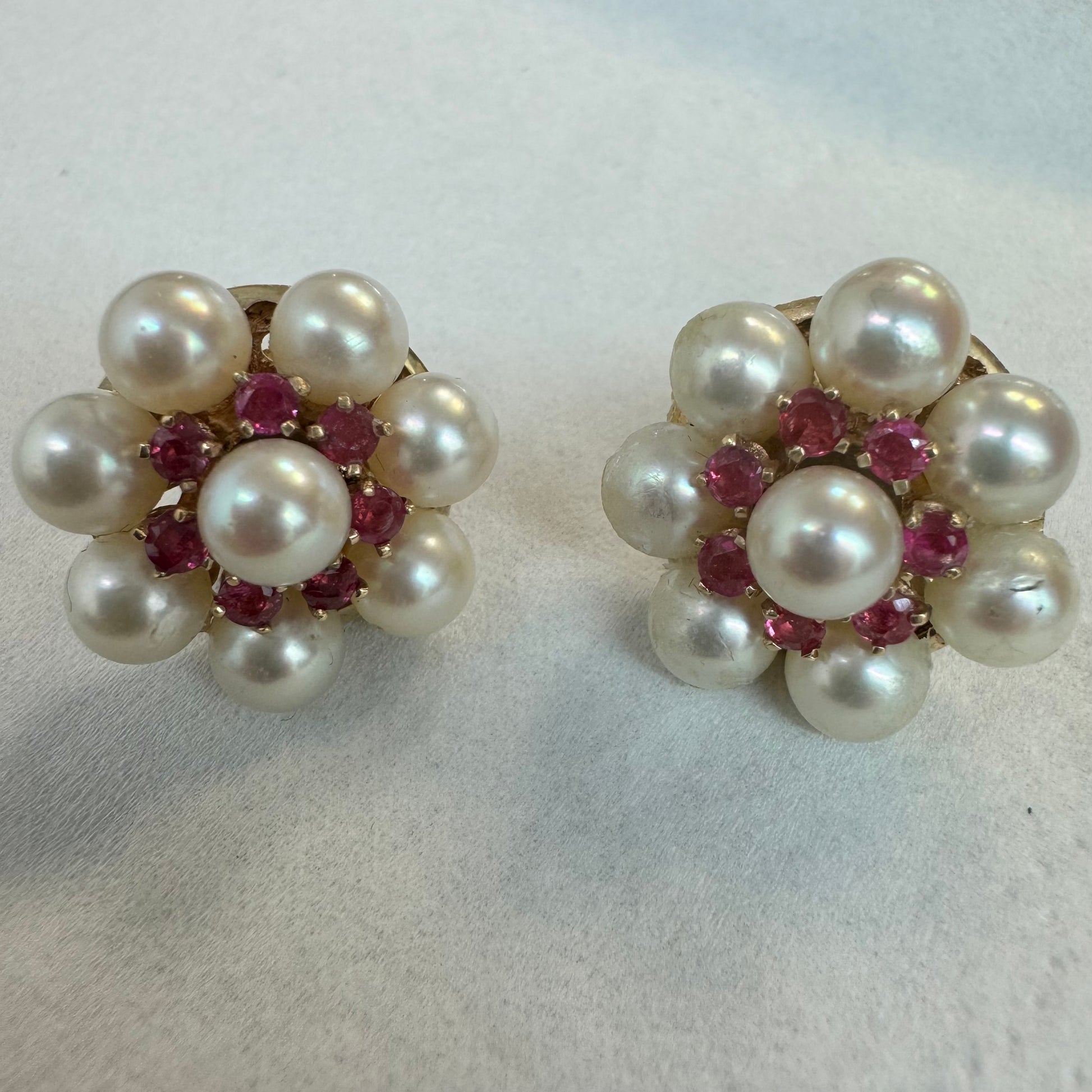 עגילי זהב צהוב 14 קראט גדולים צמודים לאוזן משובצים רובי ופנינים