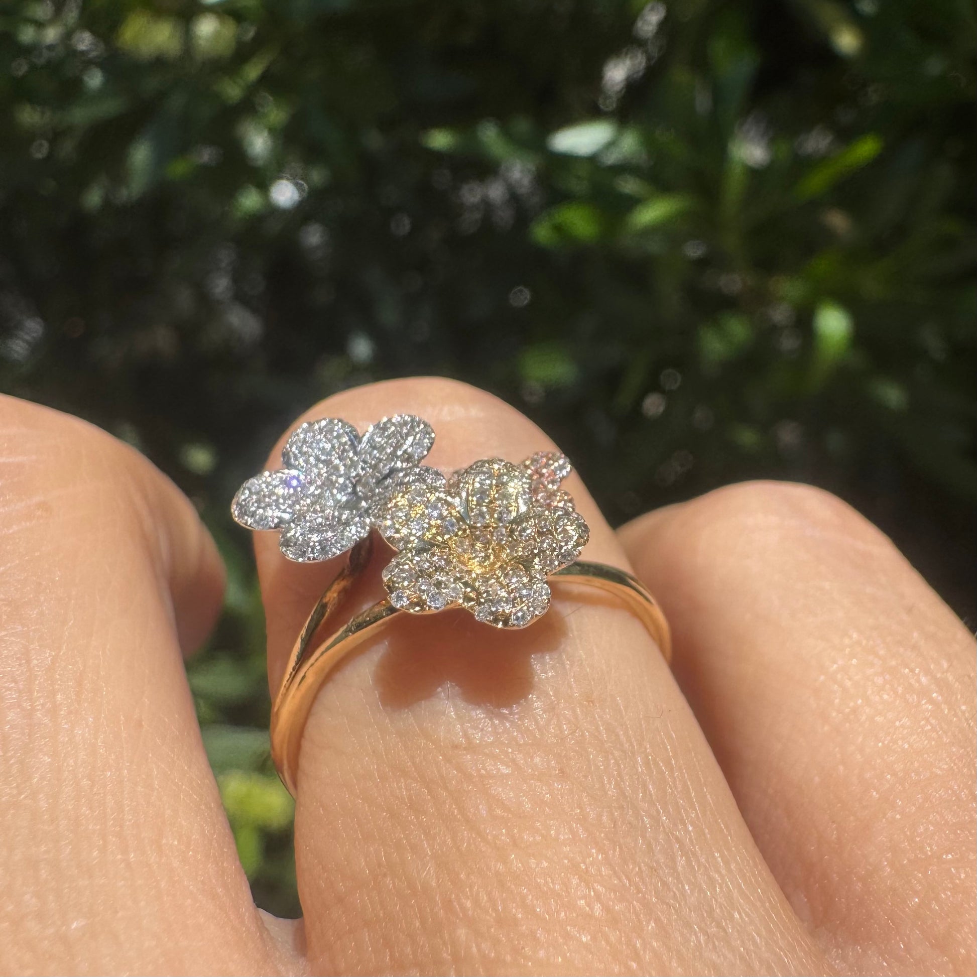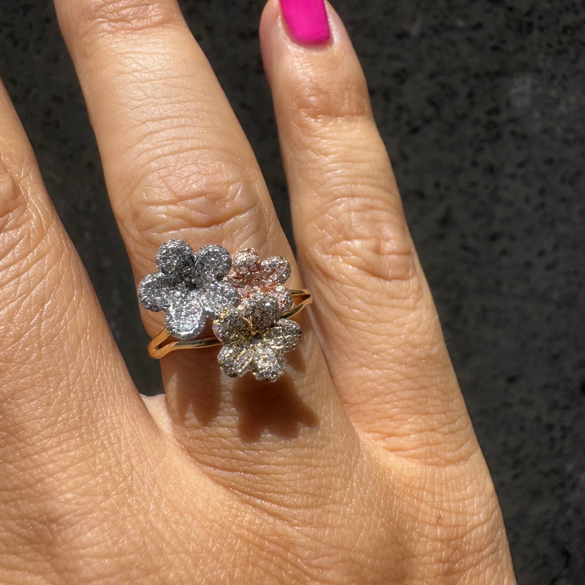 14K gold trio ring featuring white, yellow & rose gold blossoms, each encrusted with sparkling Diamonds.