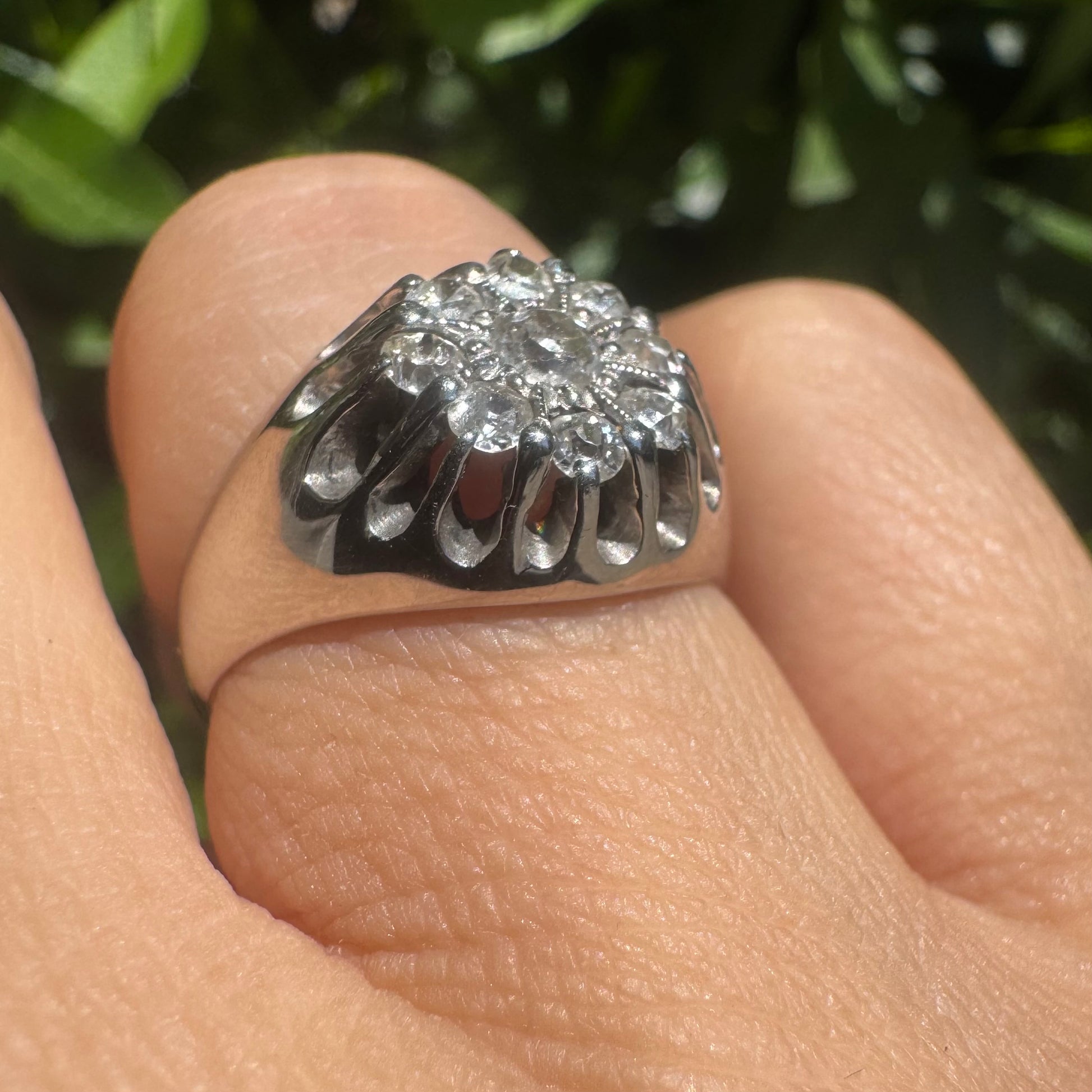 14K white gold ring set with a cluster of old cut diamonds arranged in a floral design