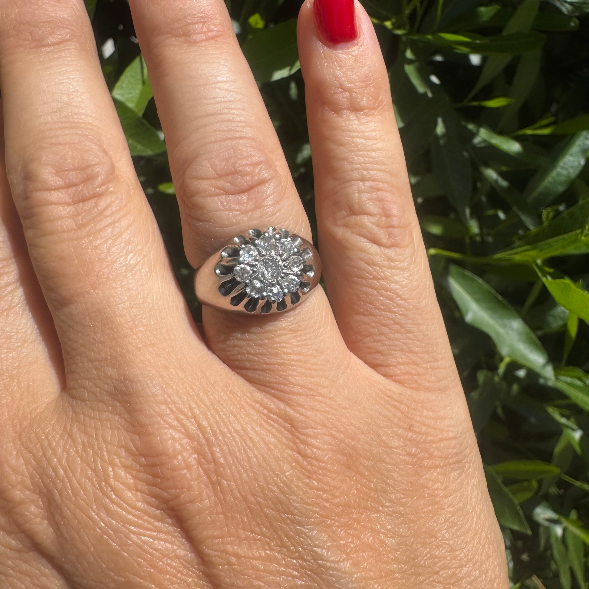 14K gold ring set with a cluster of old cut diamonds arranged in a floral design