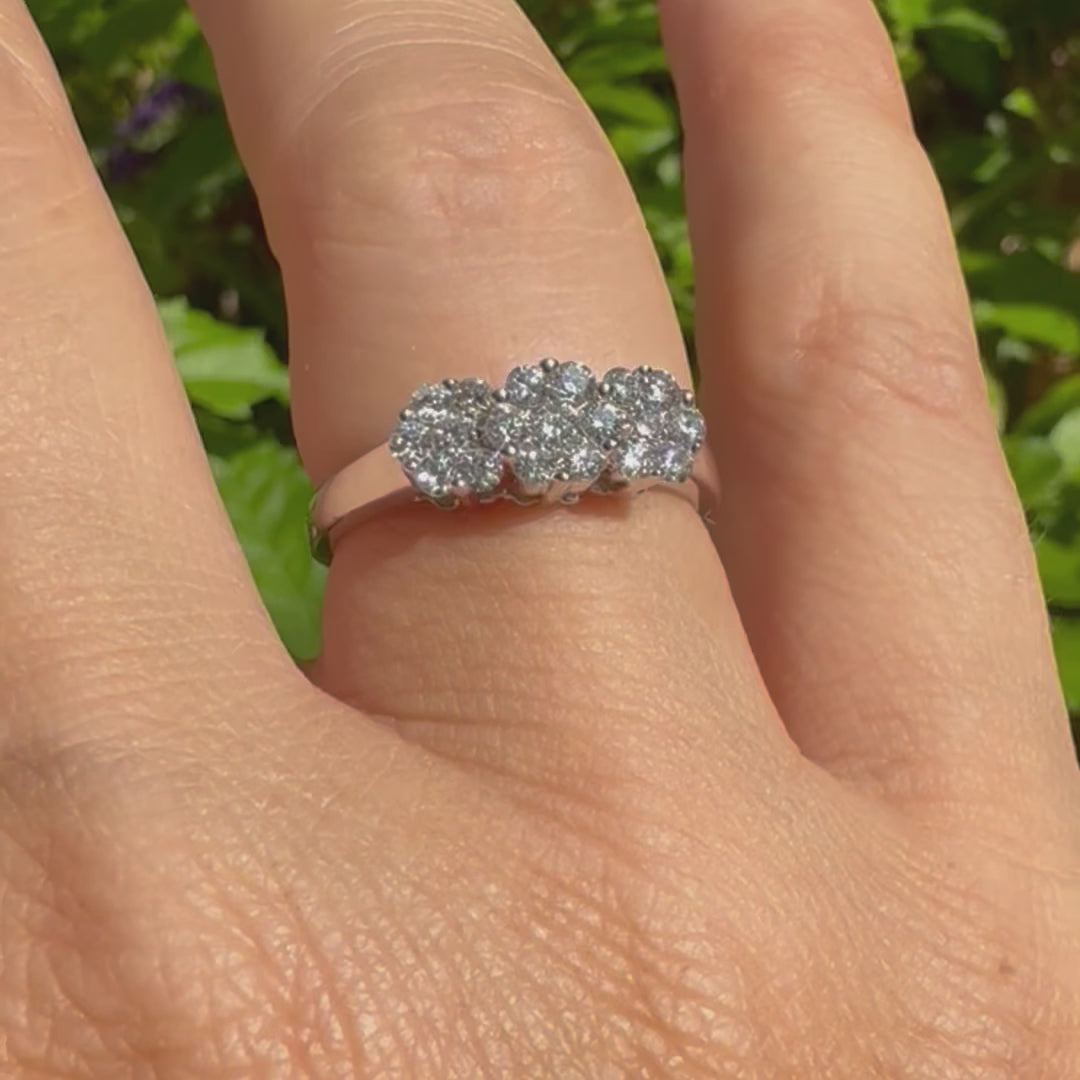 טבעת זהב לבן 14 קראט משובצת אשכולות של יהלומים לבנים נוצצים, בעיצוב אלגנטי ועל-זמני שמאיר כל הופעה