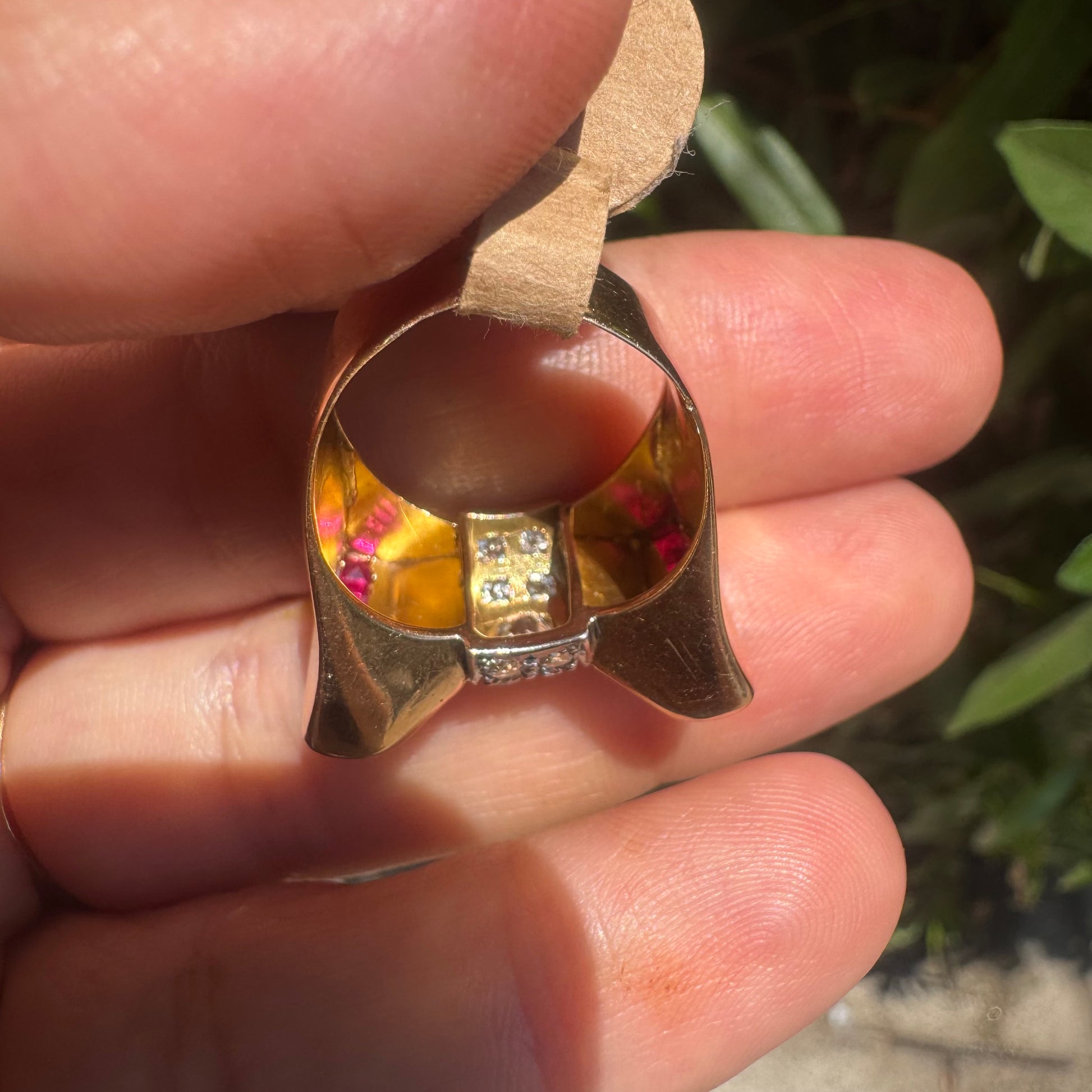 טבעת זהב 18 קראט בצורת פפיון, משובצת ביהלומים במרכז ובאבני רובי בחיתוך מרובע בצדדים.