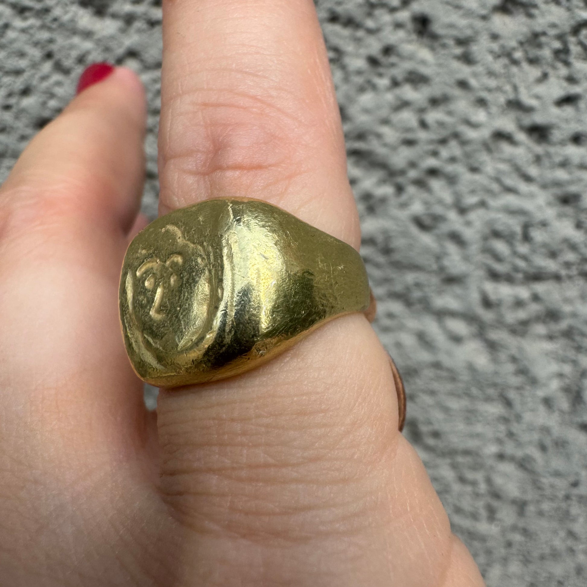 18K gold chunky gold ring with a rustic, organic finish, featuring an engraved abstract face motif at its center.