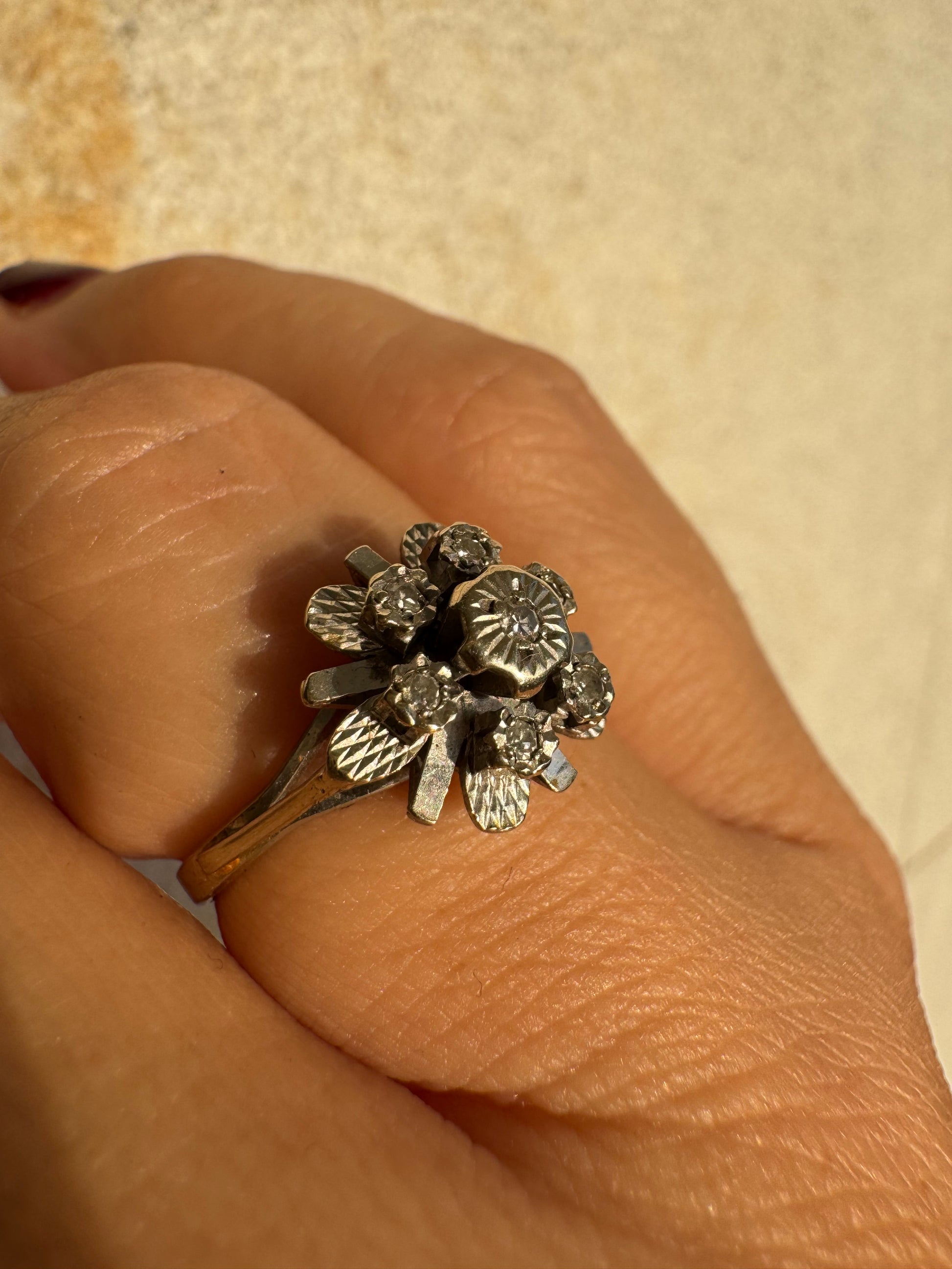 טבעת פרחונית זהב לבן 18 קראט משובצת בנגיעות יהלומים עדינות.