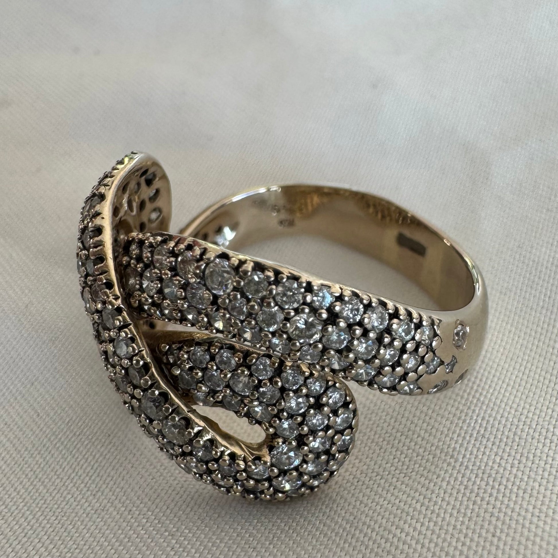 טבעת בעיצוב דיונה המשובצת כולה יהלומים נוצצים, המסמל נצח וחיבור.