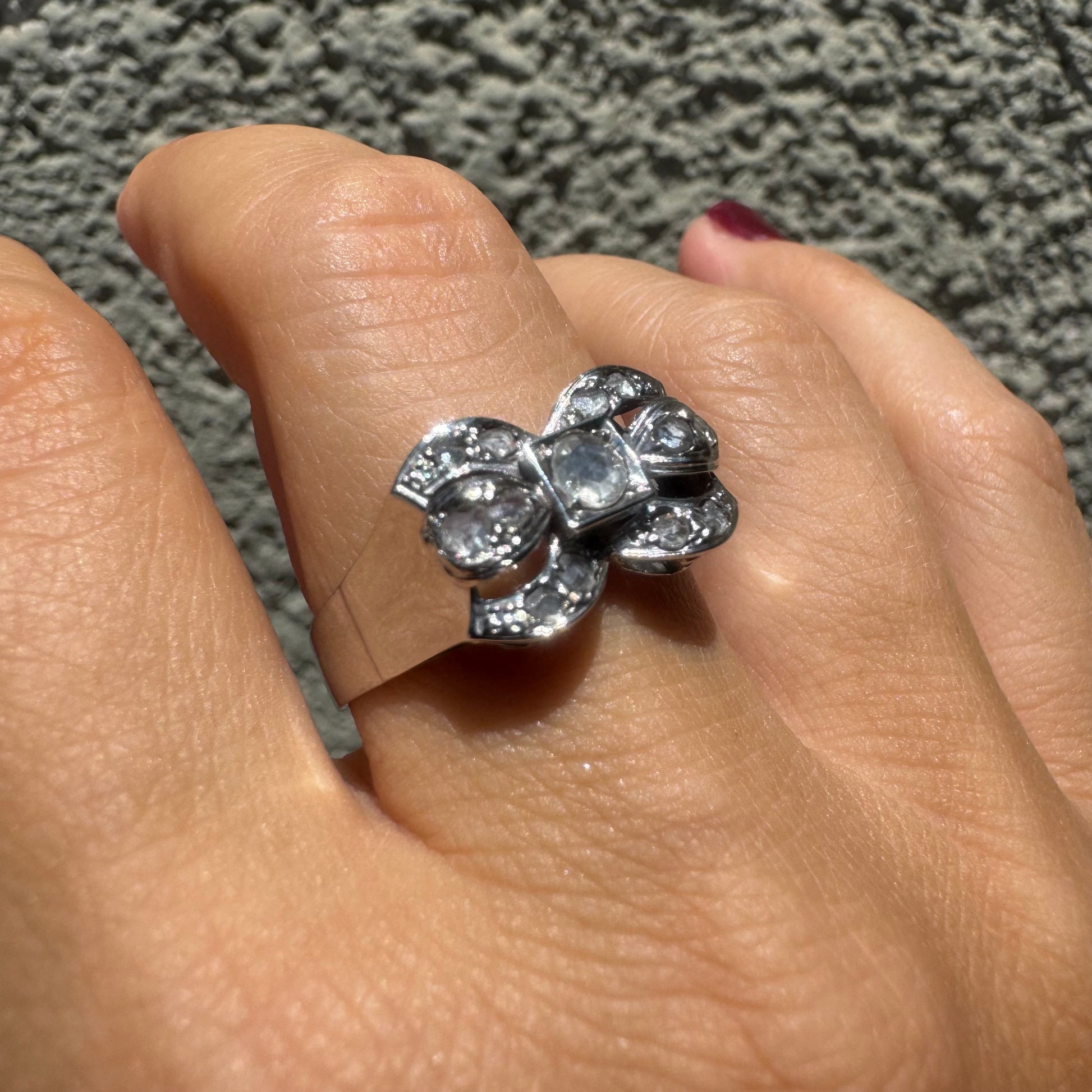 טבעת זהב לבן 18 קראט בעיצוב פפיון משובצת יהלומים בליטוש ישן