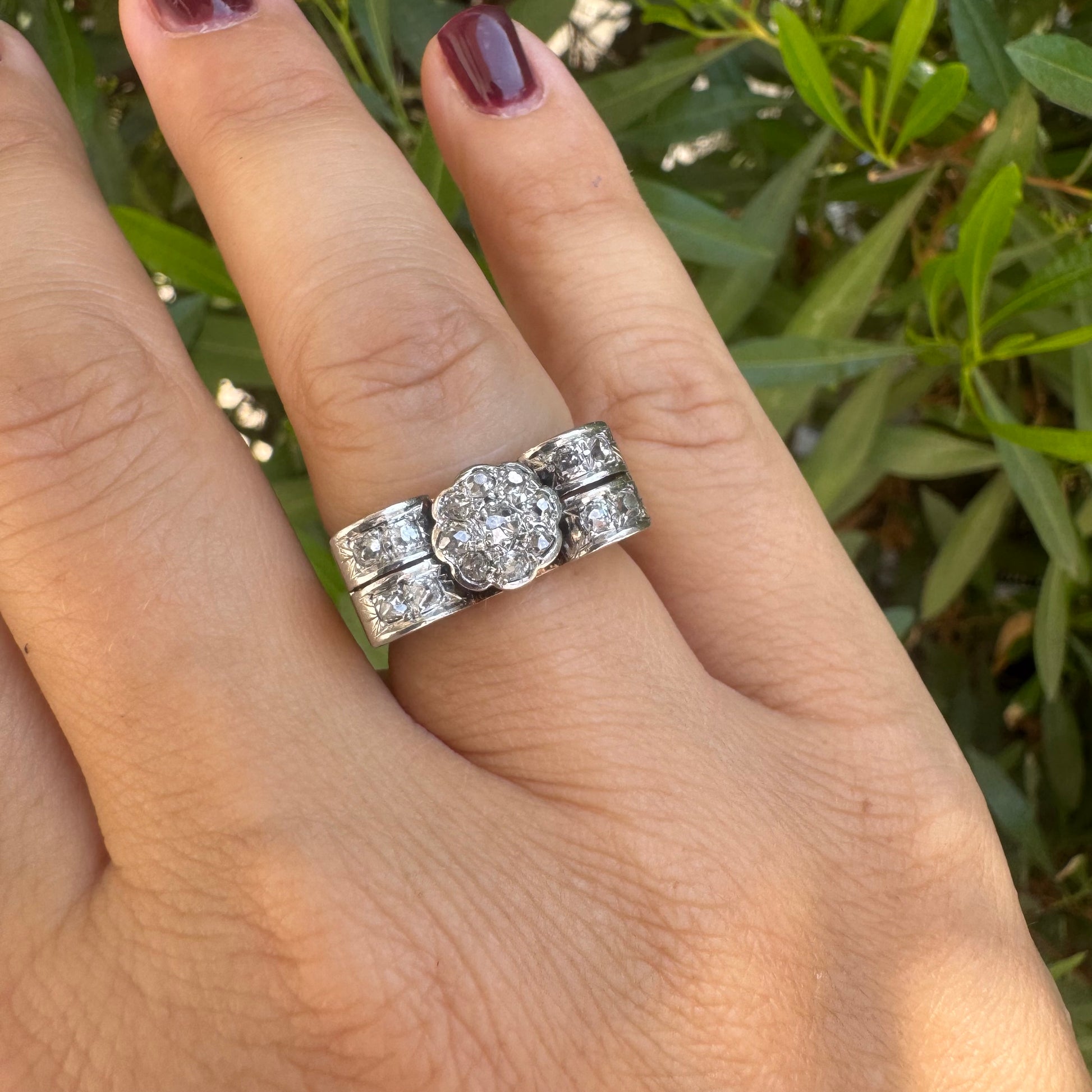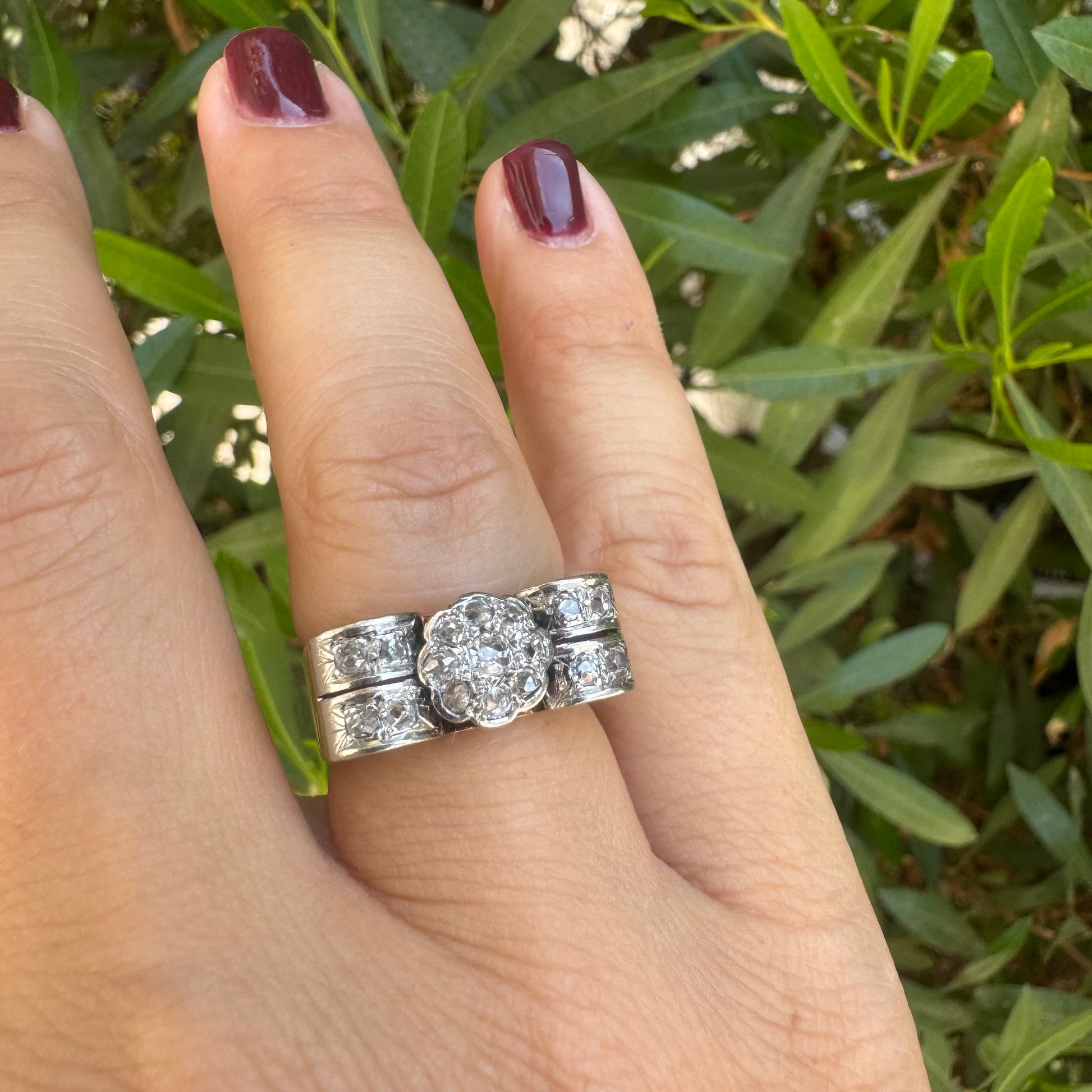 טבעת זהב צהוב ולבן 18 קראט בעיצוב פרח משובץ יהלומים עתיקים.