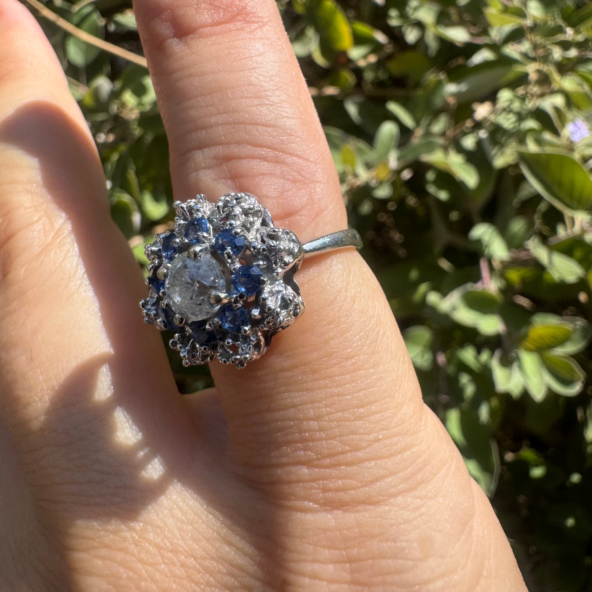 18K gold ring featuring a large round Diamond at the center, surrounded by a floral halo of purple -blue Tanzanite and & Diamonds.