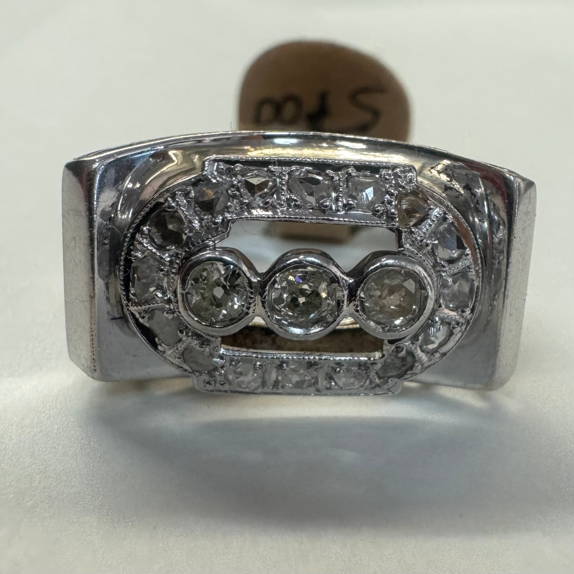 טבעת זהב לבן 18 קראט רחבה, משובצת שלושה יהלומים עגולים במרכז, מוקפים במסגרת מלבנית המשובצת יהלומים
