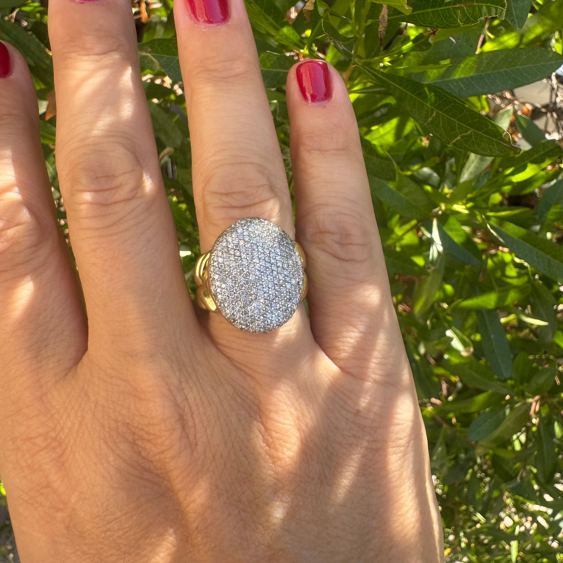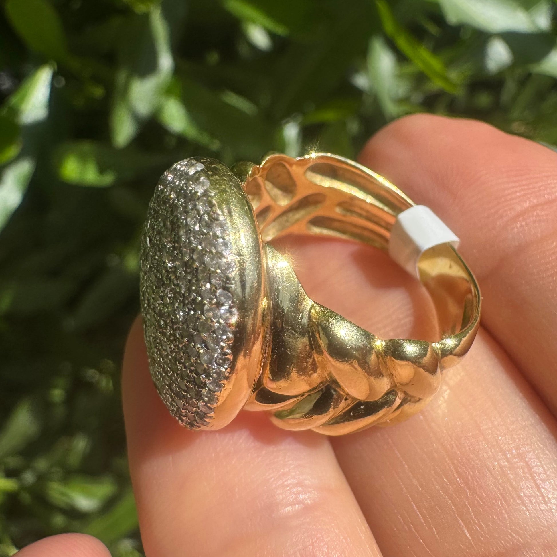 טבעת זהב 18 קראט משובצת בכיפת יהלומים נוצצים בשיבוץ פאבה, לעיצוב וינטג’ עוצמתי ומלא ברק.
