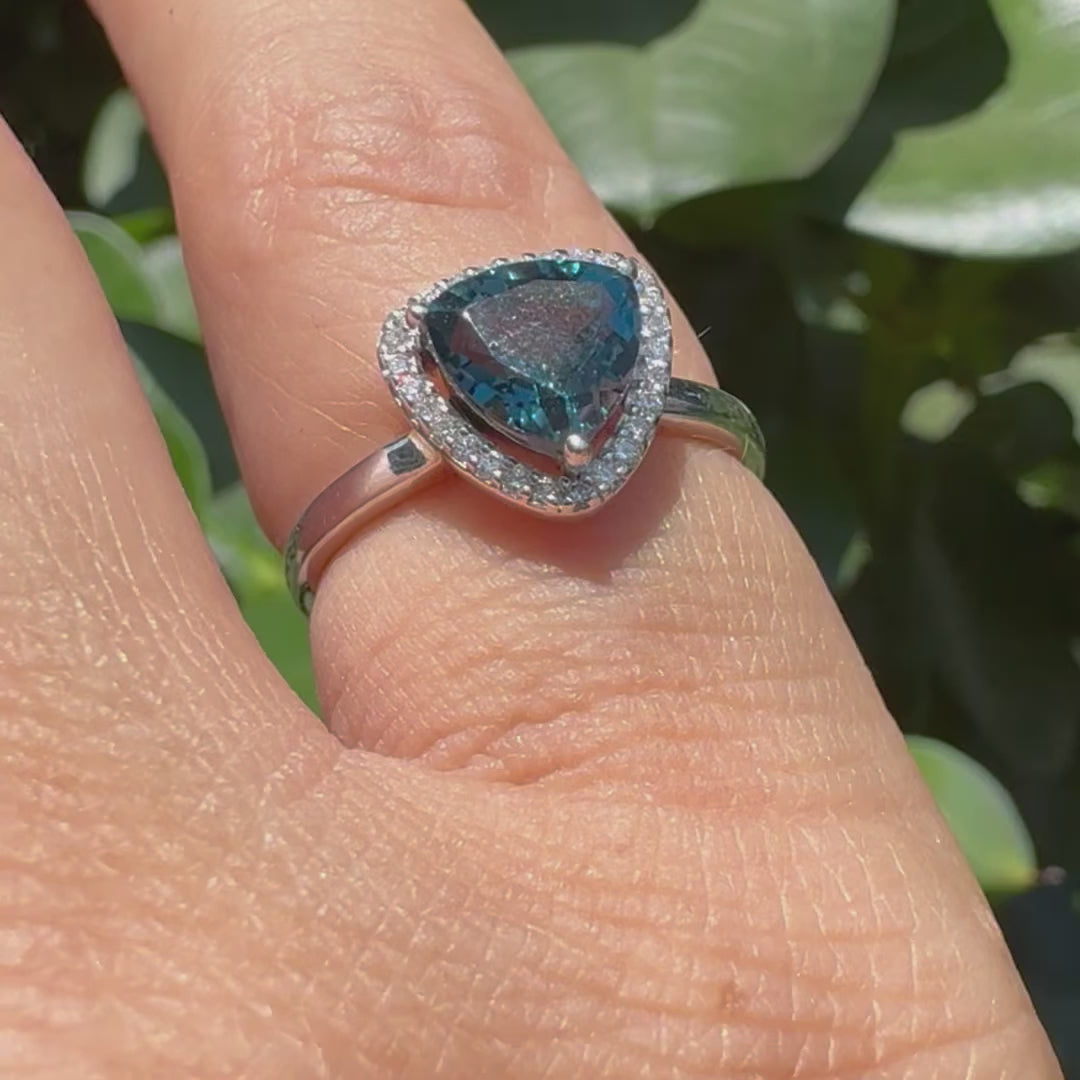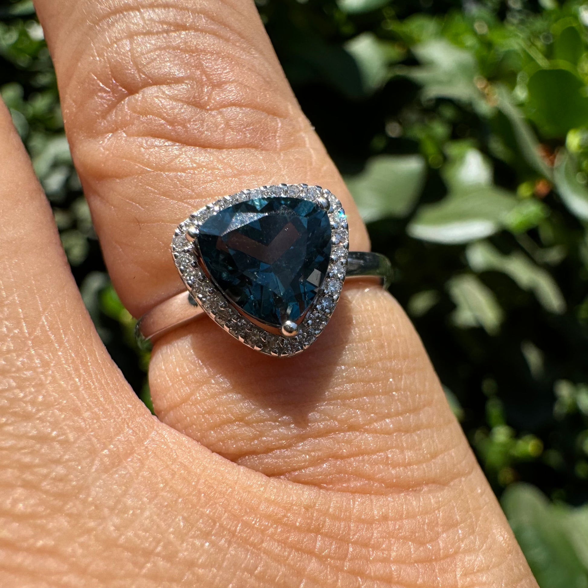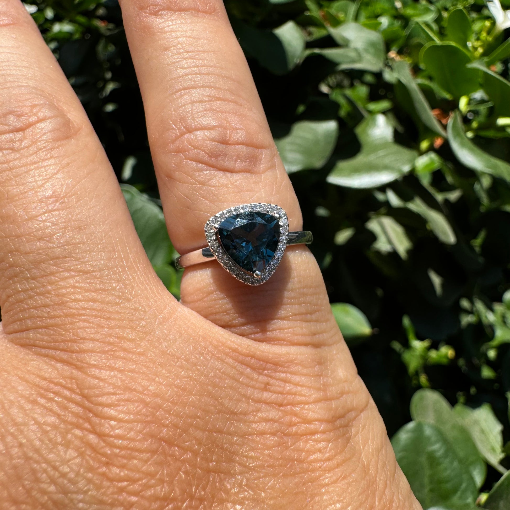 טבעת זהב לבן 18 קראט משובצת אבן טופז לונדון כחולה בחיתוך משולש