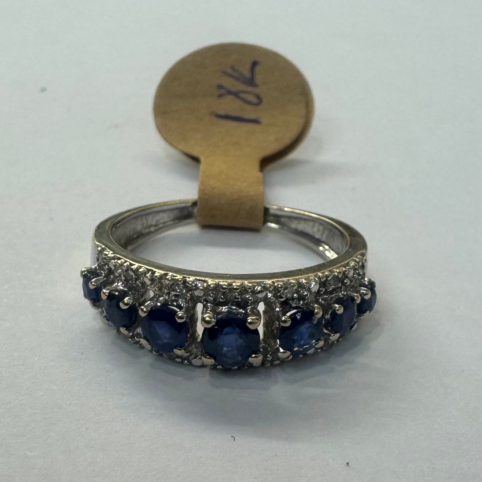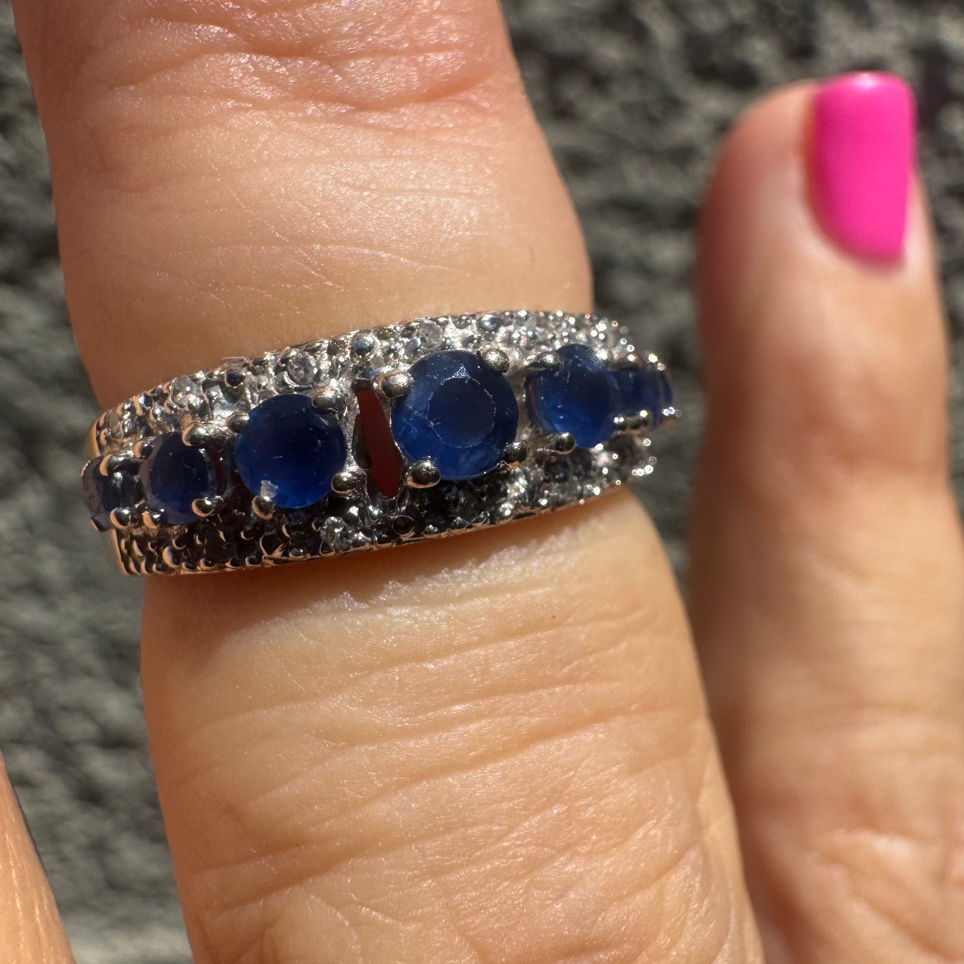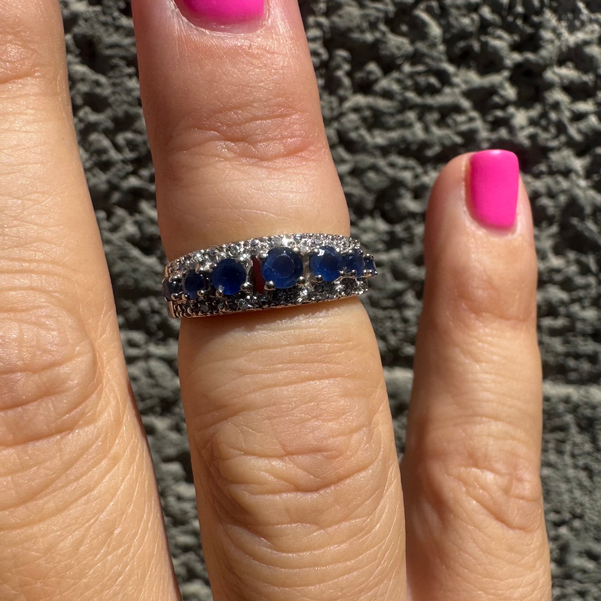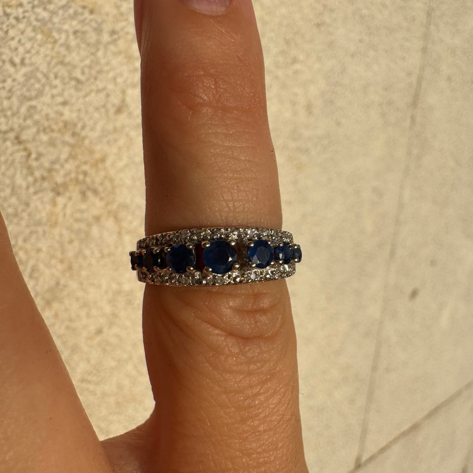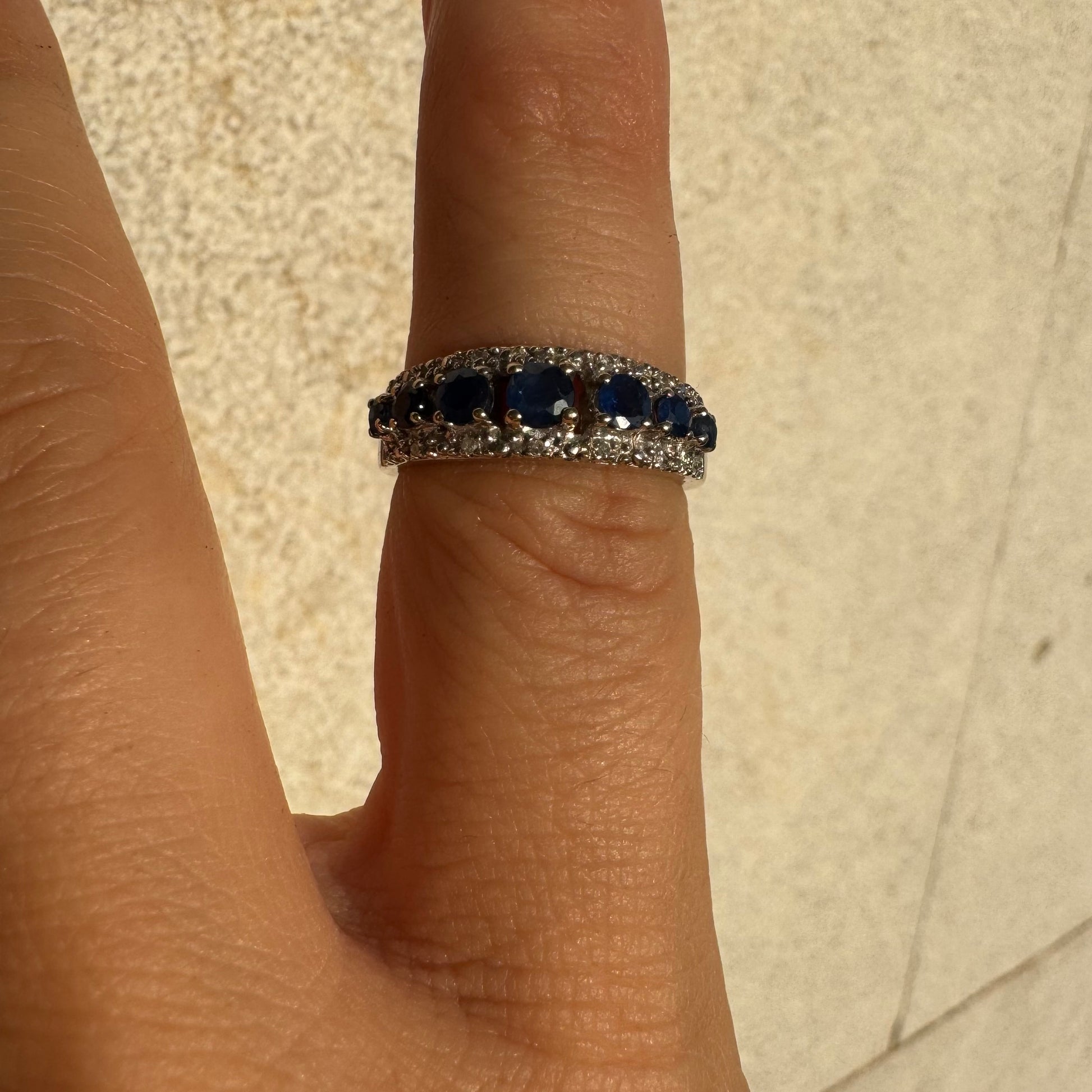 טבעת זהב לבן 18 קראט משובצת אבני ספיר כחולות בחיתוך עגול, מוקפות בשתי שורות נוצצות של יהלומים.