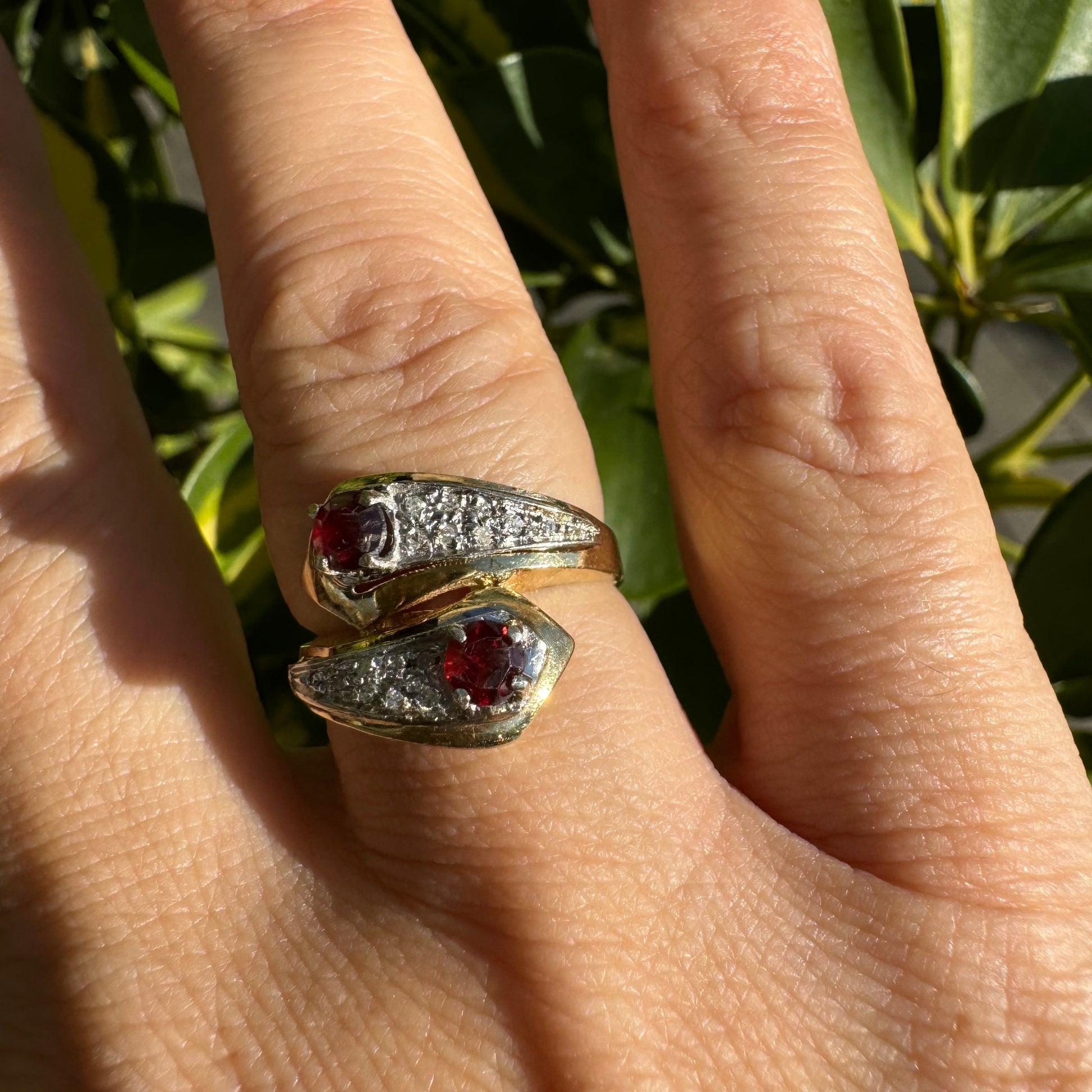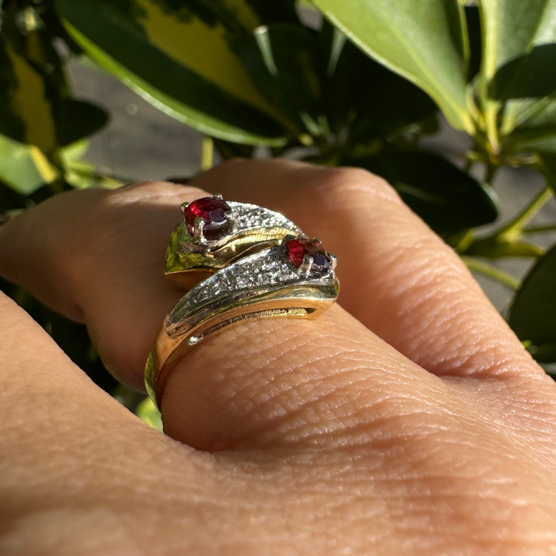 טבעת זהב צהוב 18 קראט משובצת יהלומים ואבני גרנט