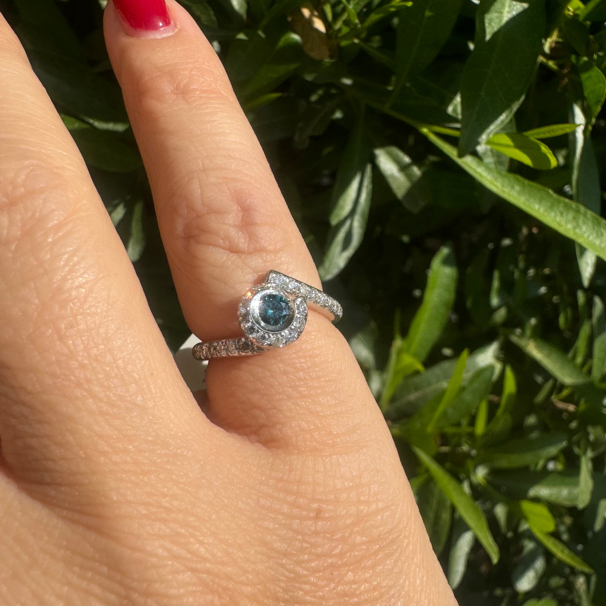 18K gold ring set with a vivid blue Diamond at its heart, embraced by a shimmering halo of white diamonds and a bold open design