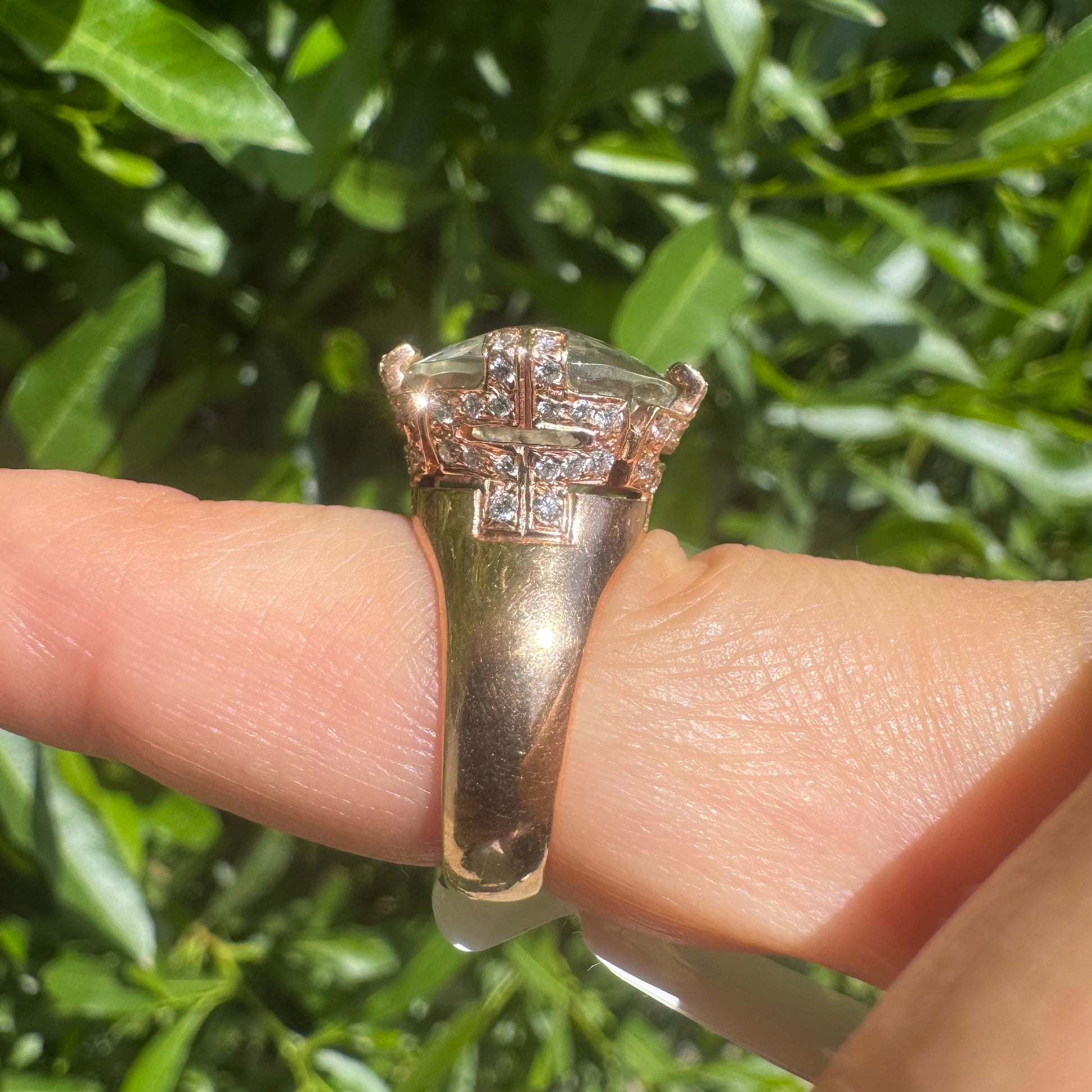 18K rose gold ring set with a stunning faceted Prasiolite, delicately accented with Diamonds on each prong