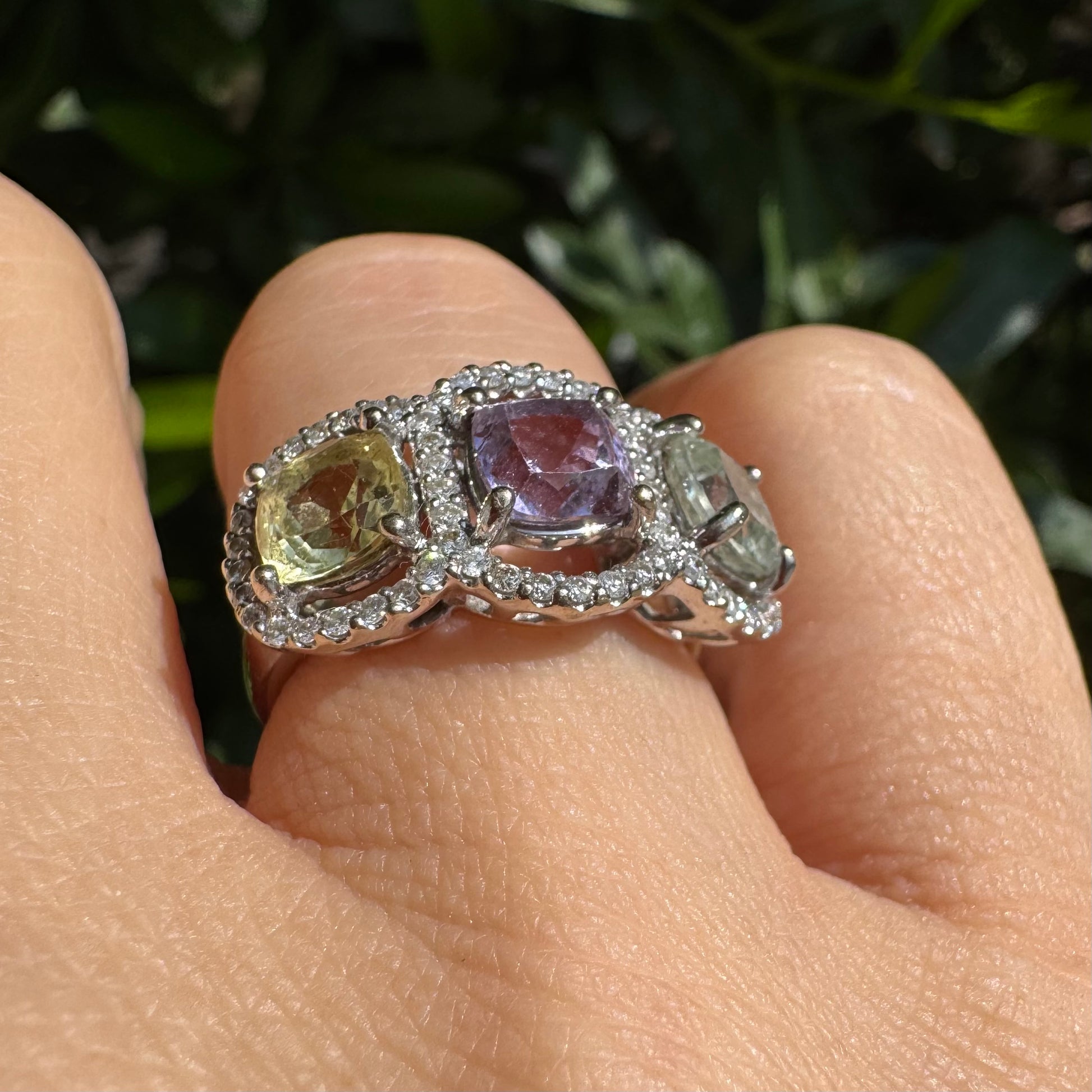 18K white gold ring set with three pastel gemstones in soft shades of lilac, yellow and light gray.